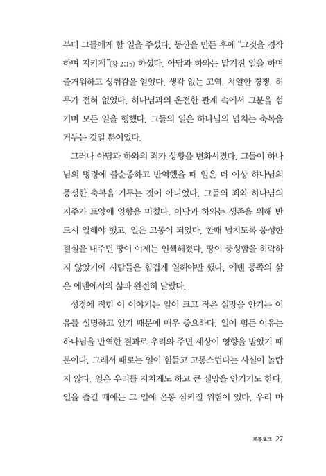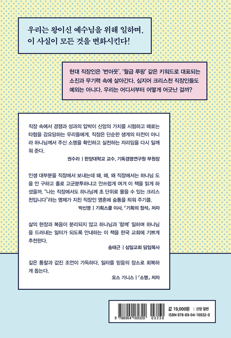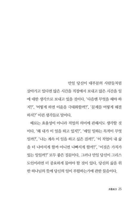 Ã¥ÀÇ Àüü ±¸¼ºÀº ¼¼ ºÎºÐÀ¸·Î ÀÌ·ç¾îÁ® ÀÖ´Ù. 1ºÎ´Â ¡®ÀÏÇÏ´Â ³ª¡¯ÀÇ ¸ð½ÀÀ» º¹À½ ¾È¿¡¼ Áø´ÜÇÑ´Ù. 2ºÎ´Â Á÷¾÷ ¼±ÅÃ, Àϰú »îÀÇ ±ÕÇü, Á÷¾÷ÀÇ °æÁß°ú °°ÀÌ Á÷ÀåÀÎÀÌ ÈçÈ÷ ¸¶ÁÖÇÏ´Â Çö½ÇÀû ¹®Á¦¸¦ ¼º°æÀÇ ½Ã°¢À¸·Î ´Ù·é´Ù. 3ºÎ´Â Á÷Àå¿¡¼ Å©¸®½ºÃµÀ¸·Î »ì¾Æ°¡±â À§ÇØ ÇÊ¿äÇÑ ÁöÇý¸¦ ³ª´©¸ç Á¶¾ð°ú µµÀüÀ» ÁØ´Ù. ¶ÇÇÑ °¢ ÀåÀÇ ³¡¿¡´Â º»¹® ³»¿ëÀ» ´õ ±íÀÌ »ý°¢ÇØ º¸µµ·Ï µ½´Â ¼º°æ ±¸Àý°ú Àû¿ë Áú¹®ÀÌ ¼ö·ÏµÇ¾î ÀÖ¾î, °³ÀÎ ¹¬»óÀº ¹°·Ð ¼Ò±×·ì ÅäÀdzª µ¶¼ ¸ðÀÓ¿¡¼µµ Ȱ¿ëÇÒ ¼ö ÀÖ´Ù.