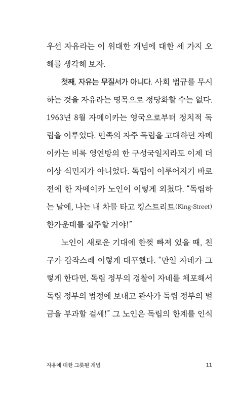 p. 14, ÀÚÀ¯¿¡ ´ëÇÑ ±×¸©µÈ °³³ä ¸¹Àº ¸ðÀÓ¿¡¼ ¡°³ª´Â ¿ÏÀüÇÏ°Ô ÀÚÀ¯·Î¿ö. ³»°¡ ¿øÇÏ´Â °ÍÀº ¹«¾ùÀ̵çÁö ÇÒ ¼ö Àְŵç!¡± ÇÏ´Â ÁÖÀåÀ» µè°ï ÇÑ´Ù. ³ª´Â ±×·± ¸»À» µéÀ» ¶§¸¶´Ù, ÁøÁ¤À¸·Î ÀÚÀ¯·Ó´Ù¸é ¹«¾ùÀ̵ç ÇÒ ¼ö ÀÖÀ» »Ó ¾Æ´Ï¶ó ±×°ÍÀ» ¸ØÃâ ¼öµµ ÀÖ´ÂÁö »ý°¢ÇØ º¸¶ó°í ¸»ÇÑ´Ù. ³ª»Û ½À°üÀ̳ª ŵµ¸¦ ¹ö¸®°í ¸¶À½À» °íÃÄ º¸·Á°í ¿½ÉÈ÷ ³ë·ÂÇÒ ¶§, ¿ì¸®´Â ÀÚ½ÅÀÌ À̱â½ÉÀ̶ó´Â ¿ÊÀ» ÀÔ°í¼ °Å±â¿¡¼ Çì¾î³ªÁö ¸øÇÏ´Â ³ë¿¹ÀÓÀ» ¾Ë°Ô µÈ´Ù. p. 27, Àΰ£ÀÇ ÀÚÀ¯ °ü·Ã À̹ÌÁö