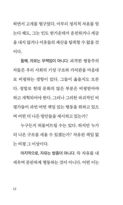 ¿Ö ÇÑ ¹ÎÁ·À̳ª Áý´Ü ȤÀº °³ÀÎÀº ÀÚÀ¯·Î¿ö¾ß¸¸ Çϴ°¡? ¿ì¸®´Â ¼Ó¹ÚÀ¸·ÎºÎÅÍÀÇ ÀÚÀ¯¸¦ ³Ñ¾î, ¾î¶² ƯÁ¤ ¸ñÀûÀ» À§ÇÑ ÀÚÀ¯¿¡ ´ëÇØ ¾Ë¾Æ¾ß¸¸ ÀÚÀ¯ÀÇ ÁøÁ¤ÇÑ Àǹ̸¦ ÀÌÇØÇÒ ¼ö ÀÖ´Ù. ±×¶§¾ß ºñ·Î¼Ò Á¦ÇÑÀÇ Á߿伺°ú ÀÚÀ¯¿¡ ³»ÀçÇÑ Ã¥ÀÓÀ» ÆÄ¾ÇÇÒ ¼ö ÀÖÀ» °ÍÀÌ´Ù.