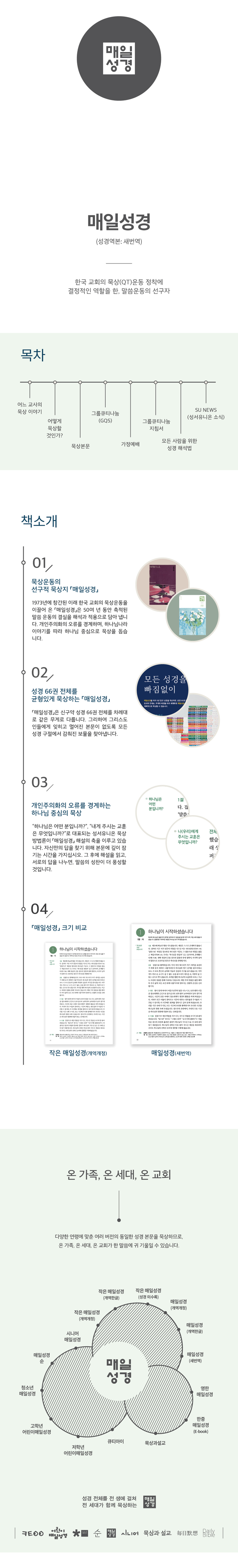 ¸ÅÀϼº°æÀº ¼º¼À¯´Ï¿Â¼±±³È¸(SCRIPTURE UNION)°¡ Çѱ¹±³È¸¿Í ¼ºµµµéÀ» À§ÇØ 1973³âºÎÅÍ ²ÙÁØÈ÷ ¹ßÇàÇØ ¿Â ťƼ ³ëÆ®ÀÔ´Ï´Ù. ¸ÅÀϼº°æÀÇ ¼Ò¸íÀº ±×¸®½ºµµÀεéÀÌ ¸ÅÀÏ ¼º°æÀ» ÅëÇØ Çϳª´ÔÀ» ¸¸³ªµµ·Ï µ½´Â ÀÏÀÔ´Ï´Ù. ÀÌ ¸ñÇ¥¸¦ À§ÇØ µ¶ÀÚ°¡ ÃÖ´ëÇÑ ¼º°æ ºÐ¹®¿¡ ÁýÁßÇÒ ¼ö ÀÖµµ·Ï °ç°¡ÁöµéÀº °ú°¨È÷ »ý·«ÇÏ°í ´ë½Å ¼º°æ º»¹®ÀÇ ÀÌÇØ¸¦ µ½´Â ÇØ¼³°ú Àû¿ëÀ» dz¼ºÇϰí Ãæ½ÇÇÏ°Ô Á¦°øÇÕ´Ï´Ù. . ¸ÅÀϼº°æÀº ½Å±¸¾à ¼º°æ 66±Ç Àüü¸¦ Â÷·Ê´ë·Î °°Àº ¹«°Ô·Î ´Ù·ì´Ï´Ù. ±×¸®ÇÏ¿© ±×¸®½ºµµÀε鿡°Ô ÀØÈ÷°í ¸Ö¾îÁø º»¹®ÀÌ ¾øµµ·Ï ¸ðµç ¼º°æ ±¸Àý¿¡¼ °¨ÃçÁø º¸¹°À» ã¾Æ³À´Ï´Ù. . ¸ÅÀϼº°æÀº ¸ðµç ¿¬·ÉÀÇ ±×¸®½ºµµÀÎÀ» ´ë»óÀ¸·Î ´«³ôÀ̸¦ ¸ÂÃá ¸ÅÀϼº°æÀ» Á¦°øÇÕ´Ï´Ù. À¯¾Æ, ¾î¸°ÀÌ, û¼Ò³â, û³â, ¼ºÀÎ, ½Ã´Ï¾î¸¦ À§ÇÑ ¸ÅÀϼº°æÀÌ ¸ðµÎ ÁغñµÇ¾î ÀÖ½À´Ï´Ù. . ¸ÅÀϼº°æÀº ÇÑ±Û »ç¿ëÀÚ ¿Ü¿¡µµ ¿µ¾î¿Í Áß±¹¾î¸¦ »ç¿ëÇÏ´Â ±×¸®½ºµµÀÎÀ» À§ÇØ ¿µÇѸÅÀϼº°æ°ú ÇÑÁ߸ÅÀϼº°æÀ» Á¦°øÇϰí ÀÖ½À´Ï´Ù. ¿Â °¡Á·ÀÌ ÇÔ²² ¸ð¿© °°Àº º»¹®ÀÇ ¼º°æÀ» ÀÐ°í ¹¬»óÇÏ°í ³ª´©´Â Áñ°Å¿î »ó»óÀÌ ¸ÅÀϼº°æÀ» ÅëÇØ Çö½ÇÀÌ µË´Ï´Ù. [»ç¿ë¹ý] ¸ÕÀú, Á¶¿ëÇÑ ½Ã°£°ú Àå¼Ò¸¦ ÁغñÇϽʽÿÀ. ±âµµ °â¼ÕÈ÷ ÁÖ´ÔÀ» ¸¸³¯ ±â´ë¸¦ ǰ°í ¸»¾¸¿¡ ´ëÇÑ ¹Ù¸¥ ÀÌÇØ¸¦ À§ÇØ ±âµµÇϽʽÿÀ. Àб⠺»¹®ÀÇ °³¿ä¸¦ ¸ÕÀú ÀÐÀ¸½Ê½Ã¿À. ¿À´Ã º»¹®À» µÎ¼¼ ¹ø ÀÐÀ¸½Ê½Ã¿À. ¹¬»ó º»¹®ÀÇ Àǹ̸¦ °ö¾Ã¾î º¸°í, ±íÀÌ »ý°¢ÇϽʽÿÀ. Çϳª´ÔÀÌ ¾î¶² ºÐÀ̽ÅÁö, ¾î¶² ±³ÈÆÀ» ÁֽôÂÁö ±â·ÏÇϽʽÿÀ. Àû¿ë Çϳª´ÔÀÇ ¶æ°ú ¼ºÇ°¿¡ ±âµµ¿Í Âù¼ÛÀ¸·Î ¹ÝÀÀÇϽʽÿÀ. ±³ÈÆÀÌ ½ÇõÀ¸·Î À̾îÁöµµ·Ï °èȹÇϽʽÿÀ. ÇØ¼³ º»¹® ÇØ¼³Àº º»¹® ÀÌÇØ¸¦ µ½°í, ¹¬»ó Æ÷ÀÎÆ®¸¦ Á¦°øÇϰí, Àû¿ëÀÇ ¹æÇâÀ» Á¦½ÃÇÕ´Ï´Ù. ¹¬»óÇÏ´Â Æ´Æ´ÀÌ Âü°íÇϰųª, ¹¬»óÀ» ³¡³½ ÈÄ¿¡ ÀÐÀ¸¸ç Á¡°ËÇϽʽÿÀ. ±âµµ ¿À´Ã ±ú´Ý°í Àû¿ëÇÑ ¸»¾¸À» ¿ÂÀüÇÏ°Ô ½ÇõÇÒ ´É·ÂÀ» Áֽñ⸦ ±âµµÇϽʽÿÀ. °øµ¿Ã¼ ±âµµ¿Í ¿¹æ ±âµµ¹®À¸·Î ±âµµÇϼŵµ ÁÁ½À´Ï´Ù. [³»¿ë ¼Ò°³] Ç¥Áö ±×¸² ÀÌÁö¿ì ÀÛ°¡(µ¿±¹´ëÇб³ Çѱ¹È Àü°ø)ÀÇ ÀÛǰÀÔ´Ï´Ù. ÀÛ°¡´Â °èÀý°ú ½Ã°£¿¡ µû¶ó ´Þ¶óÁö´Â dz°æÀÇ ºûÀ» Æ÷ÂøÇÏ¿©, Àϻ󿡼 ¸¶ÁÖÇϴ dz°æ¿¡ ³»·Á¾É¾Æ ´Ù¾çÇÑ Ç¥Á¤°ú ÀλóÀ¸·Î ´Ù°¡¿À´Â ºû±òÀÇ Àå¸éµéÀ» ȸ鿡 »õ±â°í ÀÖ½À´Ï´Ù. °ç¿¡ µÎ°í ´Ã ÇÔ²²ÇÒ ¼ö ÀÖ´Â, ÀÏ»ó¿¡ ¾ÈºÎ¸¦ ¹¯´Â ±×¸²À» ±×¸®°íÀÚ ÇÕ´Ï´Ù. ¾î´À ±³»çÀÇ ¹¬»ó À̾߱â ÃʵîÇб³ ±³»çÀÎ ±ÇÀÏÇÑ ¼±»ýÀº ¹ÐÂøµÇ¾î ÀÖ´Â »ç¶÷ÀÔ´Ï´Ù. ¼º°æ¿¡ ¹ÐÂøµÇ¾î ÀÖ°í, ¸¸³ª´Â ¾î¸°À̵é°ú ¹ÐÂøµÇ¾î ÀÖ½À´Ï´Ù. ƯÈ÷ ¿À·§µ¿¾È ¾î¸°À̵é°ú ±Û¾²±â ¼ö¾÷À» ÁøÇàÇϸé¼, ¾î¸°À̵éÀÇ ¼Ó¸¶À½°ú ½ÇÁ¦ »î¿¡ ´©±¸º¸´Ù °¡±îÀÌ ÀÖ½À´Ï´Ù. ±×°¡ µé·ÁÁÖ´Â ¾î¸°À̵éÀÇ À̾߱â´Â ¼º°æ À̾߱â¿Í °ãÃÄÁý´Ï´Ù. ¾î¸°À̵éÀÇ À̾߱⿡ ¸¶¸®¾Æ¿Í ¸¶¸£´Ù°¡ ÀÖ°í, ¼¼·Ê ¿äÇÑÀÌ ÀÖ°í, ¿¹¼ö´ÔÀÌ °è½Ê´Ï´Ù. ±×°¡ µé·ÁÁÖ´Â ¼º°æ À̾߱⿡¼µµ ¾î¸°À̵éÀÇ ÇØ¸¼Àº ¸ð½ÀÀÌ º¸À̰í Ç®Á×Àº ¸ñ¼Ò¸®°¡ µé¸³´Ï´Ù. ÇÊÀÚ°¡ µé·ÁÁÖ´Â ¹¬»ó À̾߱⸦ µè°í ÀÖ³ë¶ó¸é, ¼º°æ À̾߱Ⱑ ¿À´Ã À̰÷¿¡¼ ÀçÇöµÇ°í ½ÇÇöµÇ´Â µíÀÌ ´À²¸Áý´Ï´Ù. ¸ðµç »ç¶÷À» À§ÇÑ ¼º°æ ÇØ¼®¹ý ¡º°¥¶óµð¾Æ¼ ¾î¶»°Ô ÀÐÀ» °ÍÀΰ¡¡»(¼º¼À¯´Ï¿Â), ¡º¿À´ÃÀ» À§ÇÑ È÷ºê¸®¼¡» ¡ºÀ§¼±¡»(ÀÌ»ó IVP), ¡º·Î¸¶¼ »êÃ¥¡»(º¹Àִ»ç¶÷) µîÀÇ Àú¼·Î Àß ¾Ë·ÁÁø ½Å¾àÇÐÀÚ ±Ç¿¬°æ ±³¼ö(¼þ½Ç´ëÇб³)´Â ¼º°æÀÇ º»ÀǸ¦ ¿ÀÇØÇÏ´Â ´ëÁßÀû Çö»ó¿¡ ÁÖ¸ñÇÕ´Ï´Ù. ¡®´©±¸³ª ÃæºÐÈ÷ ÀÌÇØÇÒ ¼ö ÀÖ´Â ¼º°æÀ» À߸ø ÀÌÇØÇÏ´Â ÀÌÀ¯´Â ¹«¾ùÀϱî?¡¯ ÀúÀÚ´Â ÀÌ Çö»óÀÌ °ÅâÇÑ ÀÌÀ¯¿¡¼ ºñ·ÔµÈ °ÍÀÌ ¾Æ´Ï¸ç, µû¶ó¼ Á¶±Ý¸¸ ÁÖÀǸ¦ ±â¿ïÀÌ¸é ¼º°æÀÇ º»·¡ Àǵµ¸¦ ÆÄ¾ÇÇÒ ¼ö ÀÖ´Ù°í ¸»ÇÕ´Ï´Ù. ÀúÀÚ°¡ ¼º°æÀ» ÇØ¼®ÇÏ´Â ½ÇÁ¦ »ç·Ê¸¦ µé¸ç µé·ÁÁÖ´Â ¼³¸íÀ» µû¶ó°¡¸é, ´©±¸³ª ¼º°æÀÇ Âü¶æÀ» ÆÄ¾ÇÇÏ´Â ¹æ¹ýÀ» ÀÍÈú ¼ö ÀÖ½À´Ï´Ù. ¼º°æ °³°ü ¹¬»ó ¹æ¹ýÀ» ¾Ë¾Æµµ ¼º°æÀ» ¸ð¸£¸é ±æÀ» ÀÒ½À´Ï´Ù. ±×·¡¼ ±× ±æÀ» ¿©·¯ ¹ø °É¾îº» »ç¶÷, °ð Àü¹®°¡ÀÇ Á¶¾ðÀÌ ÇÊ¿äÇÕ´Ï´Ù. ¼º°æ °³°üÀº ÇØ´ç º»¹®ÀÇ Å« ±×¸², Áß¿äÇÑ ÁöÁ¡, »ý°¢ÇÒ ÁÖÁ¦¸¦ ´Ù·ì´Ï´Ù. ¿©ÇàÀ» ¶°³ª±â Àü¿¡ °¡À̵带 »ìÇÇ°í °èȹÀ» ¼¼¿ì´Â °Íó·³, ¹¬»óÀÇ ¿©Á¤À» ¶°³ª±â Àü¿¡ ¹Ýµå½Ã ¼º°æ °³°üÀ» Àб⸦ ±ÇÇÕ´Ï´Ù. º»¹® ÇØ¼³ ¸ÅÀϼº°æÀº Çϳª´ÔÀº ¾î¶² ºÐÀÎÁö, ³»°Ô Áֽô