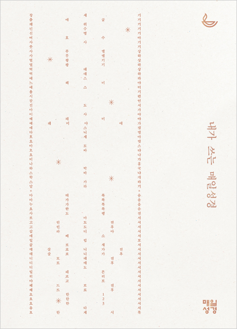 ¼Õ³¡À¸·Î ¸¶À½¿¡ »õ±â´Â ¸ÅÀϼº°æ ¡¸¸ÅÀϼº°æ¡¹À» ÅëÇØ ¼º°æ ¹¬»óÀÇ ¹Ù¸¥ ±âÁØÀ» Á¦½ÃÇØ ¿Â ¼º¼À¯´Ï¿ÂÀÌ »õ·Ó°Ô Á¦¾ÈÇÏ´Â ÇÊ»ç¿Í ÇÔ²²Çϴ ťƼ. <³»°¡ ¾²´Â ¸ÅÀϼº°æ> ÇÊ»ç³ëÆ®´Â ÇÊ»ç»Ó ¾Æ´Ï¶ó ťƼ¿¡µµ Ȱ¿ëÇÒ ¼ö ÀÖ´Ù. ¡¸¸ÅÀϼº°æ¡¹À¸·Î ¹¬»óÇϰí Àû¿ëÇß´Ù¸é, ÀÌÁ¦ ¡¸¸ÅÀϼº°æ¡¹À» ¿Å°Ü ÀûÀ¸¸ç ¸»¾¸À» ¸ö°ú ¸¶À½¿¡ »õ±â°í ½À°üÀ¸·Î ÀÚ¸® Àâ°Ô ÇØ º¸ÀÚ. ³ªÀÇ ¹¬»ó ¿©Á¤ÀÌ Â÷°îÂ÷°î ³ëÆ®¿¡ ±â·ÏµÇ¸ç ½×¿© °¥ °ÍÀÌ´Ù. ¡¸¸ÅÀϼº°æ¡¹ Çʻ翡 ²À ¾Ë¸ÂÀº µðÀÚÀÎ ¨ç ¡¸¸ÅÀϼº°æ¡¹°ú ÇÔ²²ÇÒ ¶§ °¡Àå ¾Ë¸ÂÀº µðÀÚÀΰú ±¸¼ºÀ¸·Î Á¦ÀÛµÈ ³ëÆ®. Ç¥ÁöÀÇ ¼º°æ ¸ñ·Ï¿¡ ±× ´ÞÀÇ º»¹®À» Ç¥½ÃÇÒ ¼ö ÀÖ°í, À帶´Ù ÀÖ´Â ³¯Â¥¿Í ÀåÀý Ç¥±â¶õÀ» Ȱ¿ëÇÏ¿© ±×³¯ÀÇ ¸»¾¸À» ±â·ÏÇÒ ¼ö ÀÖ´Ù. ¨è 180µµ ÆîħÀ» À¯ÁöÇÏ´Â ¾çÀå Á¦º»°ú ºñħÀÌ ÀûÀº ¿ëÁö·Î Á¦ÀÛµÈ ÇÊ»ç Àü¿ë ³ëÆ®·Î, Æí¾ÈÇÑ ÇÊ±â°æÇèÀ» ¼±»çÇÑ´Ù. ¨é <³»°¡ ¾²´Â ¸ÅÀϼº°æ> ÇÊ»ç³ëÆ® ÇÑ ±ÇÀ¸·Î ¡¸¸ÅÀϼº°æ¡¹ µÎ È£¸¦(4°³¿ù ºÐ·®), ¼¼ ±Ç ¼¼Æ® ±¸¸Å ½Ã ¡¸¸ÅÀϼº°æ¡¹ ¿©¼¸ È£¸¦(1³â ºÐ·®) ÇÊ»çÇÒ ¼ö ÀÖ´Ù(´Ü, ±Û¾¾ Å©±â¿¡ µû¸¥ Â÷ÀÌ´Â ¹ß»ýÇÒ ¼ö ÀÖ´Ù). *´ÜǰÀº ÇÑ °¡Áö »ö»ó Ç¥Áö·Î(gold ¹Ú), ¼¼Æ®´Â ¼¼ °¡Áö »ö»ó Ç¥Áö·Î(gold/sky blue/crome ¹Ú) ±¸¼ºµÇ¾î ÀÖ´Ù. **ÇÔ²²ÇÏ´Â ¾²±â °æÇè-¸ÅÀϼº°æ ÇÊ»ç Ä¿¹Â´ÏƼ ¼·ÎÀÇ Çʻ縦 ÀÎÁõÇÏ°í °Ý·ÁÇÏ´Â ¡®ÇÊ»ç Ä¿¹Â´ÏƼ¡¯¸¦ ÅëÇØ ¡¸¸ÅÀϼº°æ¡¹ ÇÊ»ç 縰Áö¿¡ Âü¿©ÇØ º¸¼¼¿ä! [Ç¥Áö]